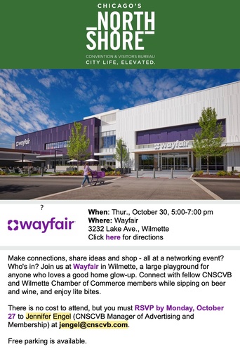 Join the Chicago North Shore Convention and Visitors Bureau and Wayfair for an evening of making connections, sharing ideas, and shopping--all while networking and enjoying beer, wine and light bites with fellow Wilmette/Kenilworth Chamber members!